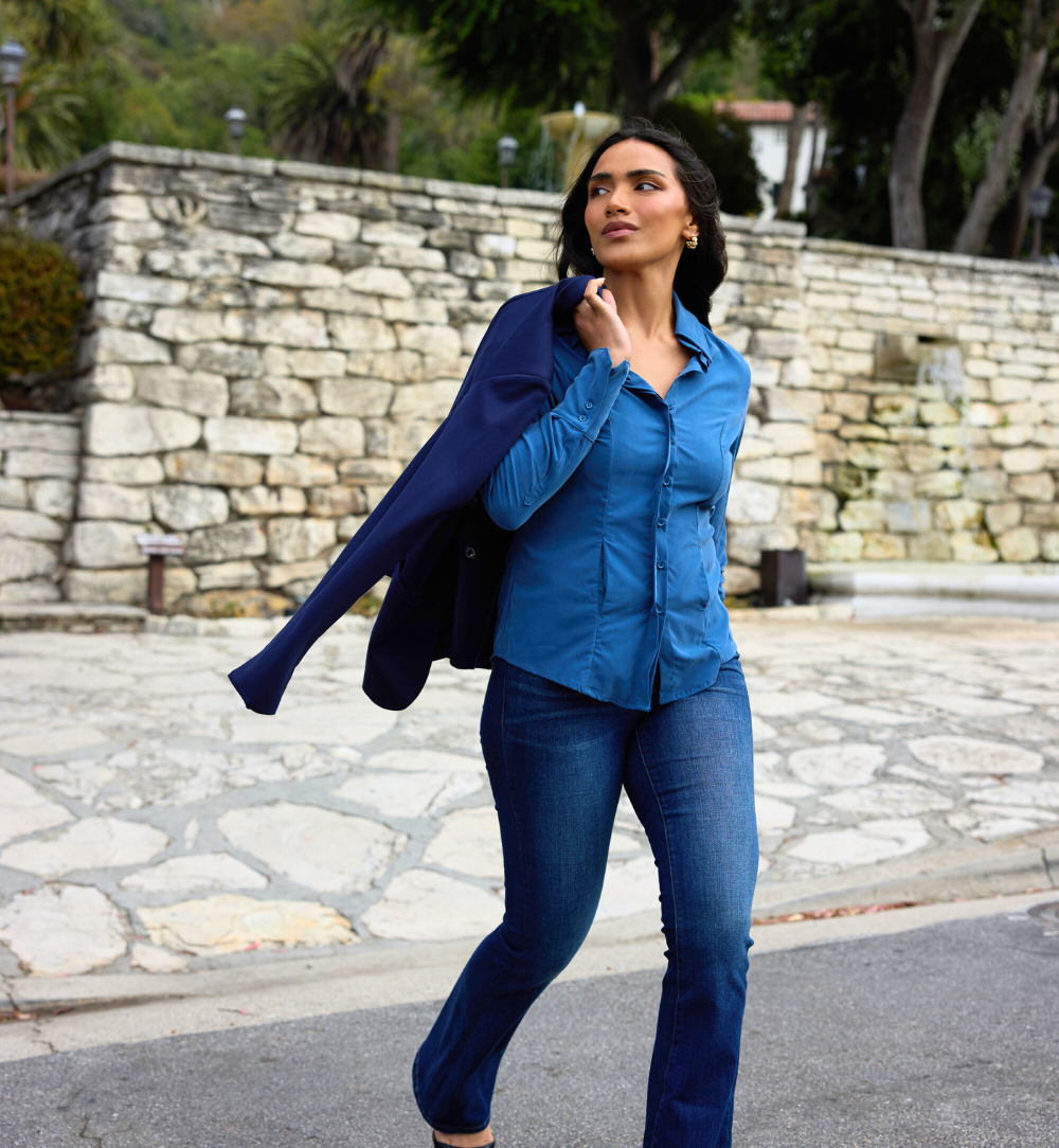 Our garments combine flexibility and form, featuring 4-way stretch, tailored structure, and breathable, machine-washable fabrics sourced in the USA. They're built to move with you, hold their shape, and support real life—without extra effort.